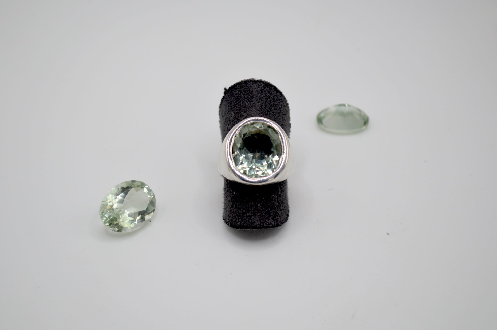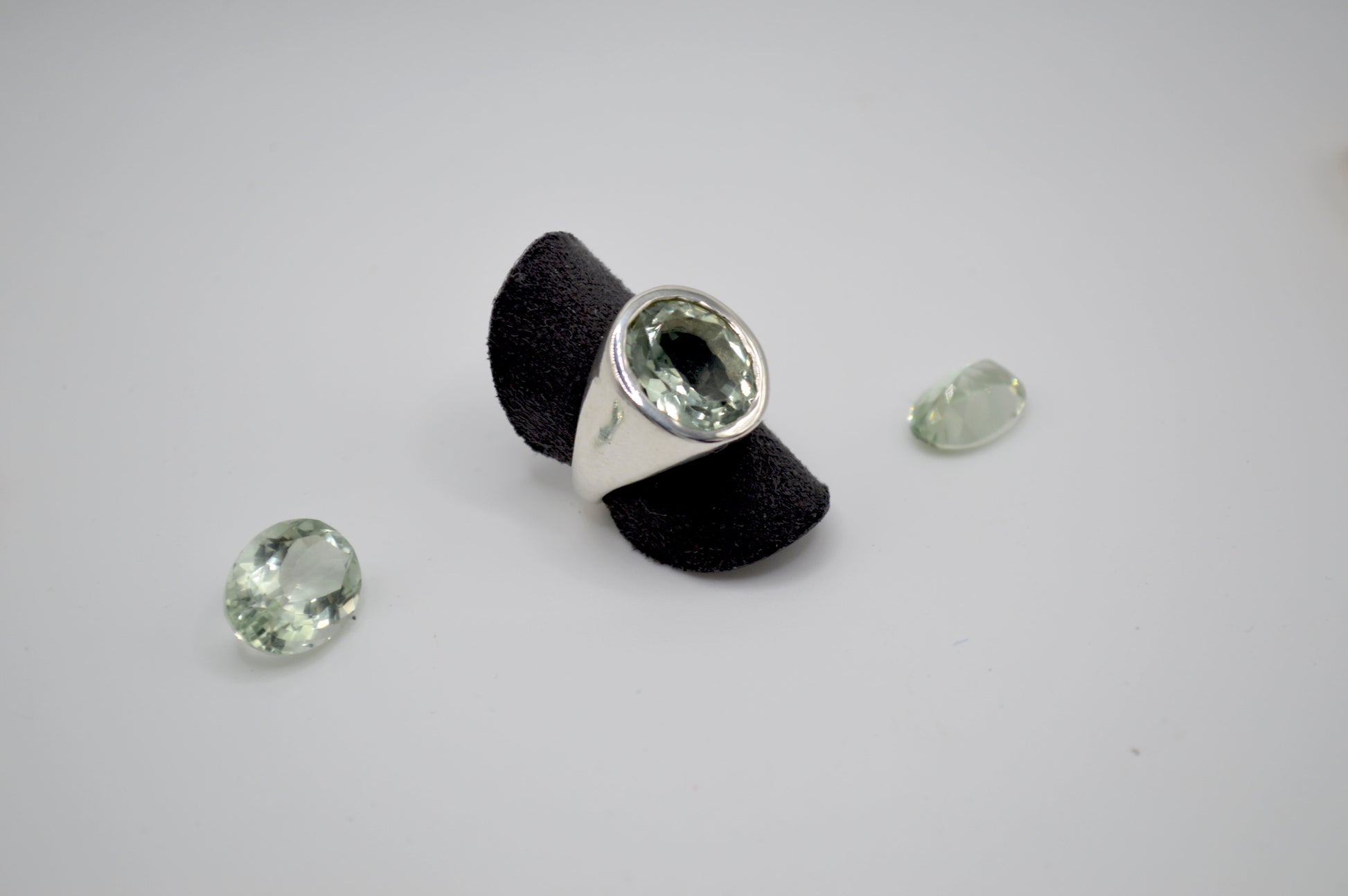 A one-of-a-kind handcrafted sterling silver ring set with a large green Amethyst that reflects light so beautifully it creates an ocean like aura.