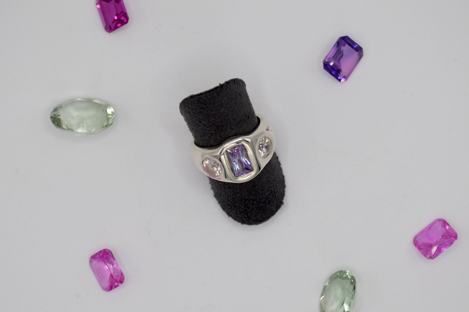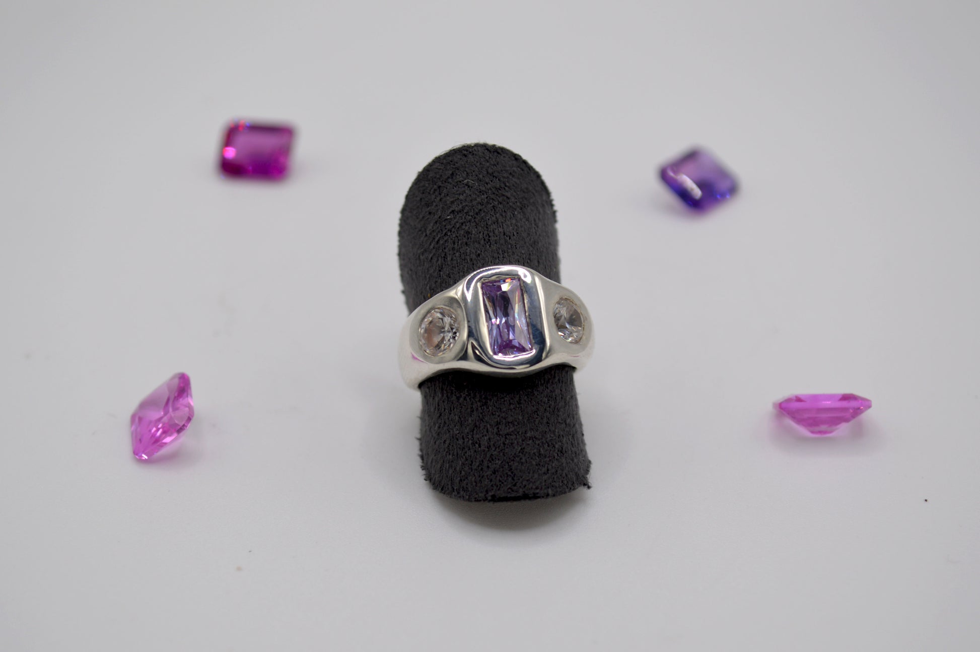 A handcrafted one-of-a-kind chunky sterling silver ring set with three sparkly Cubic Zirconia. A vibrant rectangular purple centre stone, framed by two clean, bright stones. Bold yet wearable, this design brings a contemporary take on a classic silhouette.