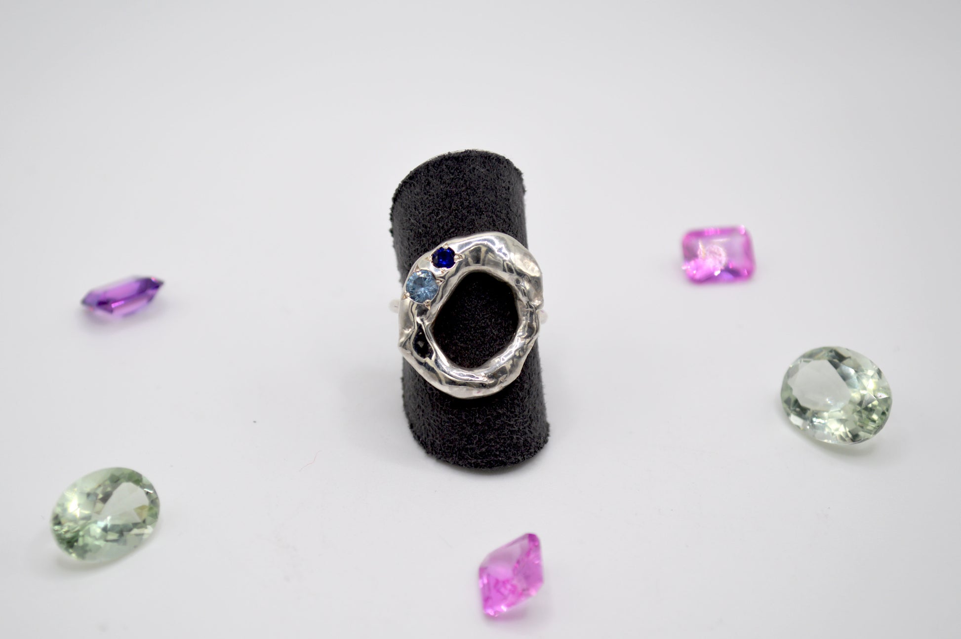 A one-of-a-kind sterling silver ring set with a lab-grown sapphire and cubic zirconia. Rich in texture, the Organic ring is a bold statement piece that seamlessly embodies the raw beauty of nature.