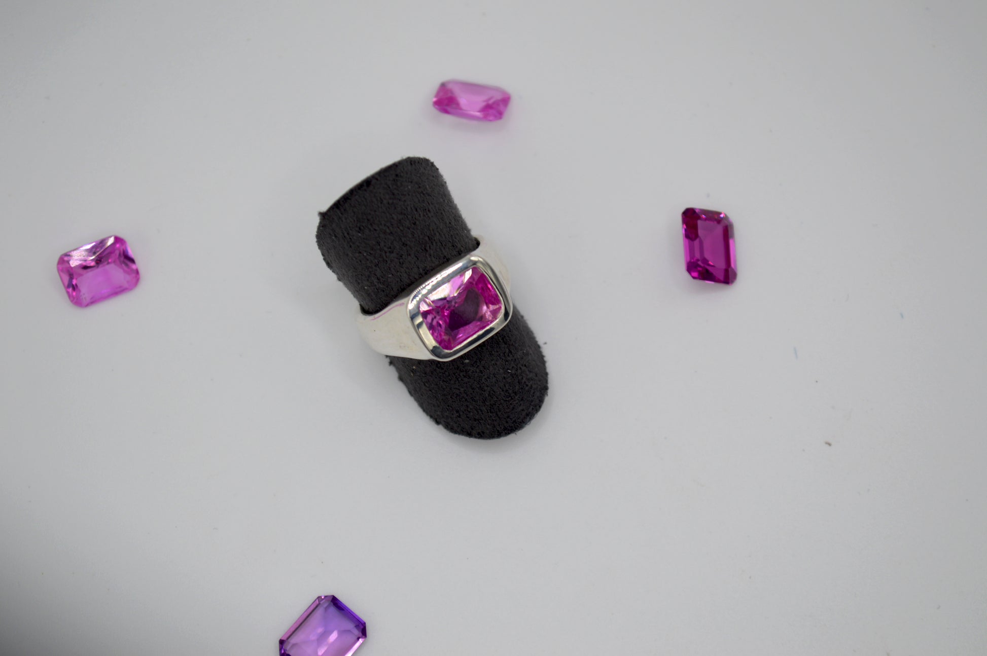 A handcrafted, one-of-a-kind sterling silver ring set with a bright pink lab-grown sapphire. This chunky design makes a statement, yet its smooth finish offers an exceptionally comfortable fit for everyday wear. Trust me, you won’t be disappointed.